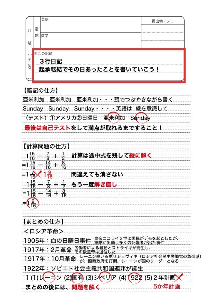 間違いを消して書き直すのではなく、なぜ間違えたのかが分かる形で残すことが重要です。自分の弱点が見えるノートは、最高の復習教材になります。
