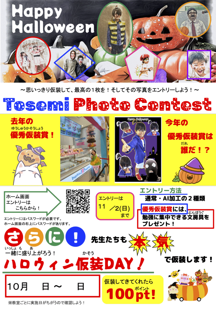 東セミ ハロウィン仮装コンテスト 2025-10-03 18:16 今年もやります! 思いっきり仮装して、最高の写真をエントリーください。 先生たちも本気の仮装をしますので お楽しみに〜 エントリーはこちら https://sites.google.com/tosemi.in/halloween 告知動画はこちら https://www.youtube.com/shorts/CodSzFFk8lA