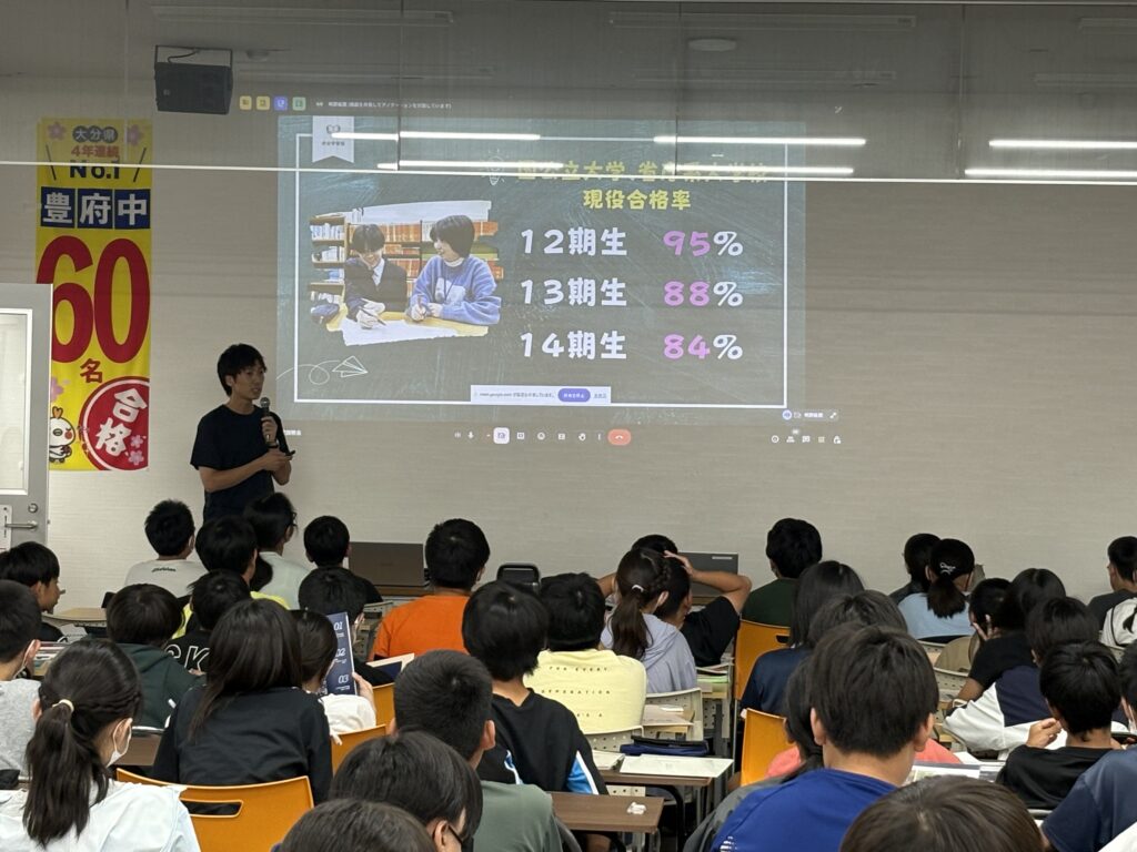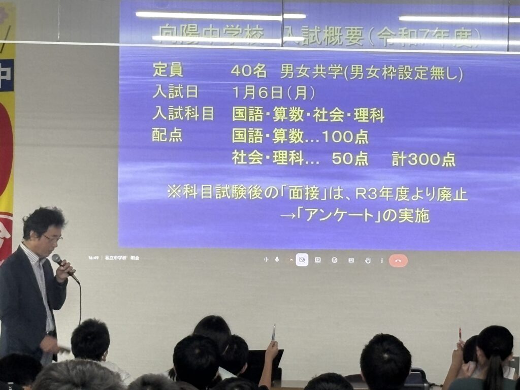 私立中 学校説明会開催 2025-10-12 17:11 本日は、南大分教室で 朝から中学入試突破講座が実施した。 模試→解説授業でしっかり力をつけていきます。 15:30からは私立中学校の先生をお招きして 私立中学校説明会を開催しました。 岩田中学校 大分中学校 向陽中学校 学校ごとの特色や入試の出題傾向など詳しく教えていただきました。 明るい未来を想像すると今、踏ん張れます!! 体調管理に気をつけて頑張って欲しいです!!