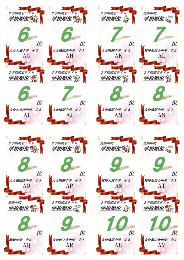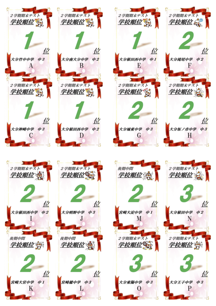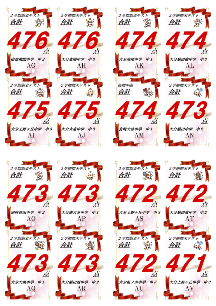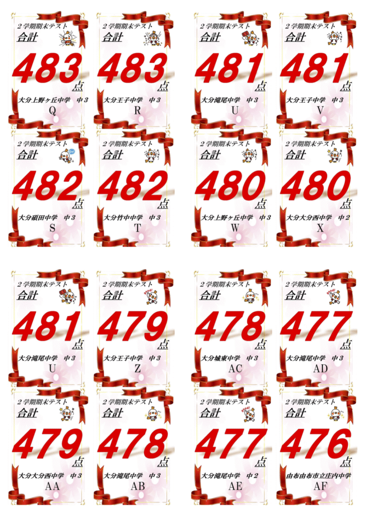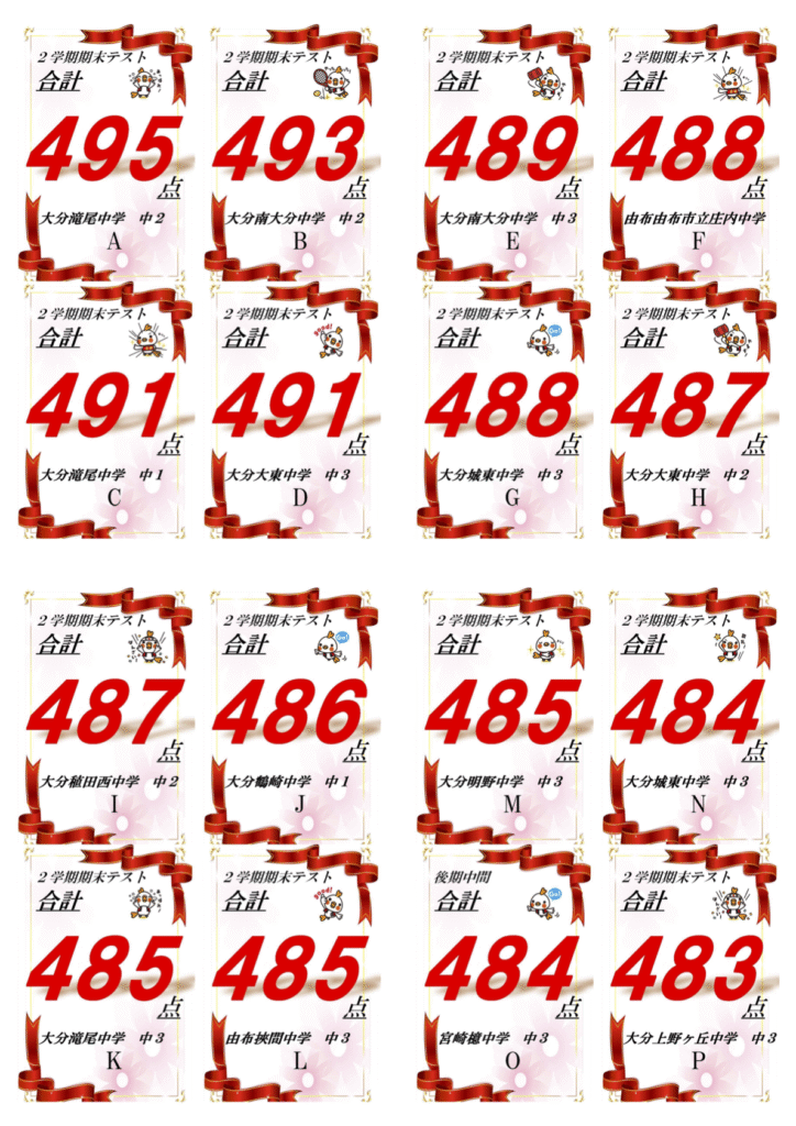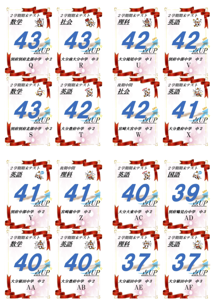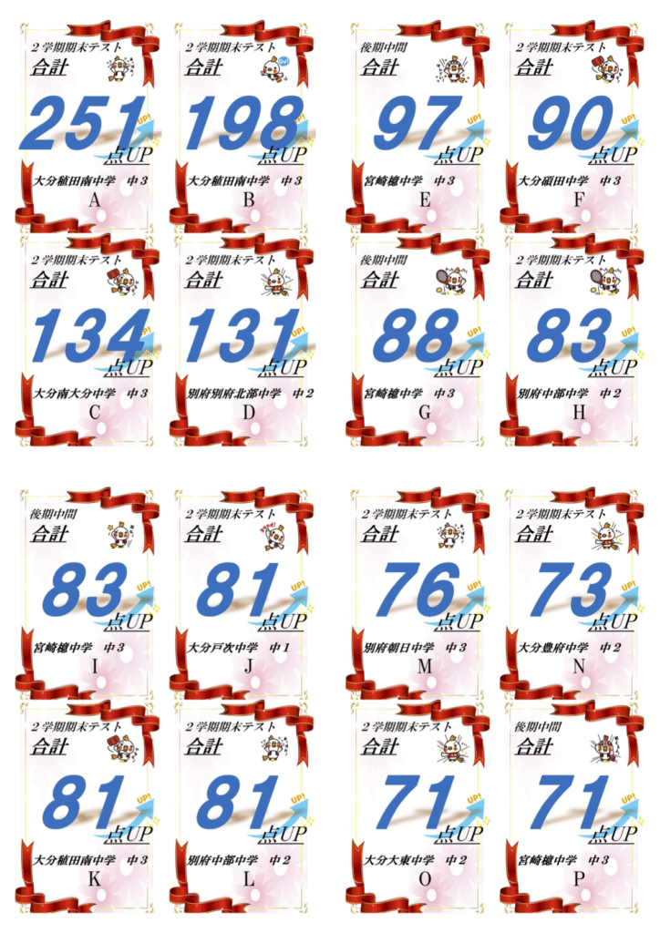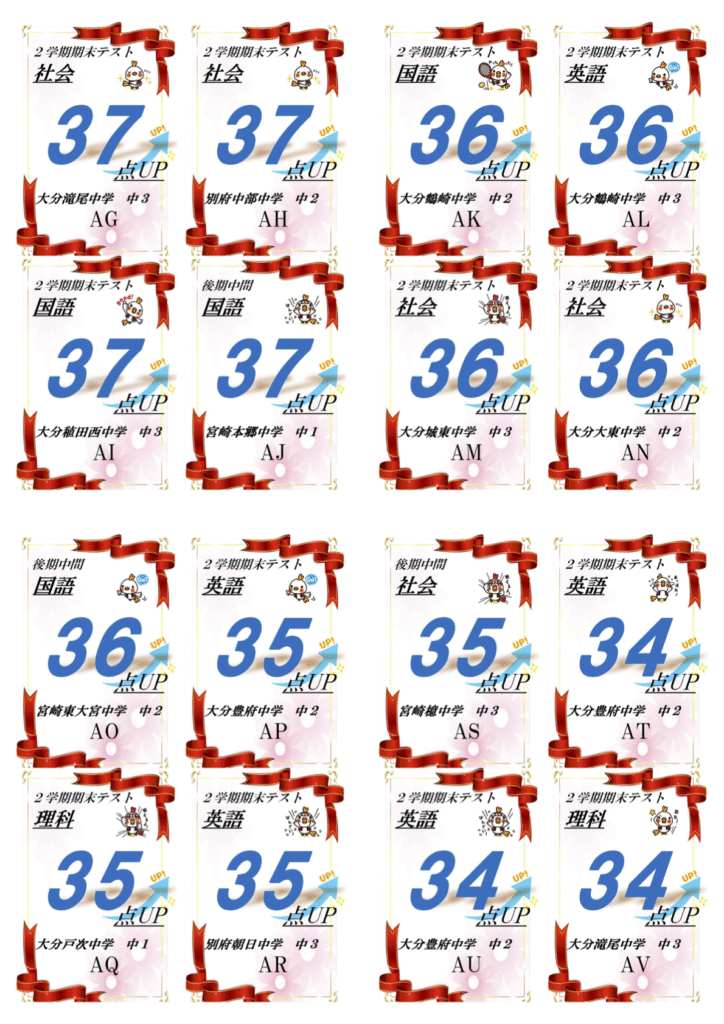 東セミの2025びっくり事例! 2025-12-10 10:00 定期テスト爆発アップ! 最新の東セミびっくり事例を紹介していきます! 2025年11月、12月で実施された期末テスト・後期中間テストから嬉しい報告がたくさん届いています!! 【5科合計UP】 【5科総合】 【順位UP】 【学年順位】 【各科目点数UP】 各教室の詳しい結果はこちらから ぜひご覧ください!! <大分県> 東セミかず家教室 明野アクロス教室 明野パッション教室 滝尾教室 かず家パッション教室 森町パッション教室 わさだパッション教室 わさだDesaki教室 南大分パッション教室 判田パッション教室 大在パッション教室 坂ノ市パッション教室 別府パッション教室 鶴見丘パッション教室 <宮崎県> 青葉町パッション教室 大塚パッション教室 大宮パッション教室 本郷パッション教室 <福岡県> 都府楼パッション教室 内申点に直結するテストで結果を出してくれました!! 実力テスト・模試の点数アップもおまかせください! 資料請求はこちら